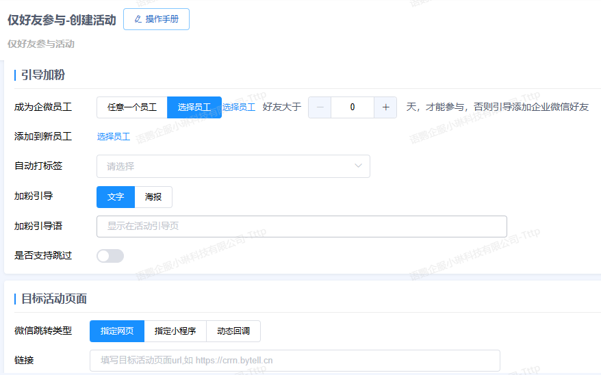 企业可以利用语鹦企服工具箱中「仅好友参与」功能,创建一个引导加微点餐的活动,填写活动基础信息,选择引导添加企微好友才能参与选项,可以用文字或海报的方式进行。并且可以指定网页或小程序跳转到目标活动页即可,这样设置可以帮助企业使用加微点餐操作来提供点餐服务,提升点餐的便携性和效率。