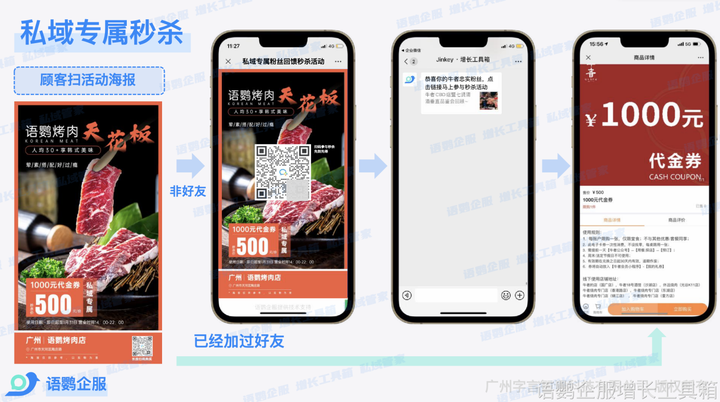 同样,餐饮行业也可以使用语鹦企服的「仅好友参与」功能设置私域秒杀的券,即在店铺发送优惠券的时候,通过嵌入「仅好友参与」功能,对参与领取优惠券的用户进行限制,要求用户先操作添加企微好友后才能领取优惠券,以此保证用户的留存。s
