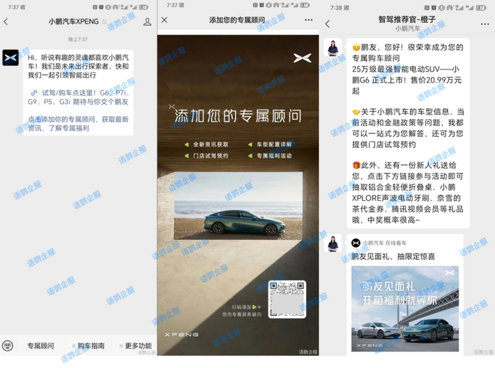内容营销:企业可以通过视频号或公众号生产有关汽车的各种内容,如购车攻略、汽车评测、汽车保养指南等,以建立自己的汽车品牌声誉和吸引流量。比如小鹏汽车的线上服务号,通过生产有关汽车的相关内容吸引用户关注,同时放置二维码引导客户添加企微好友。
