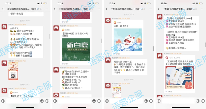 日常社群会定时推送5条以上的信息,包括社群专属优惠、特价商品推荐、商家优惠券、抽奖活动等。日常定时推送是常用的社群活跃方式,保持与用户联系,常联系提升好感度。