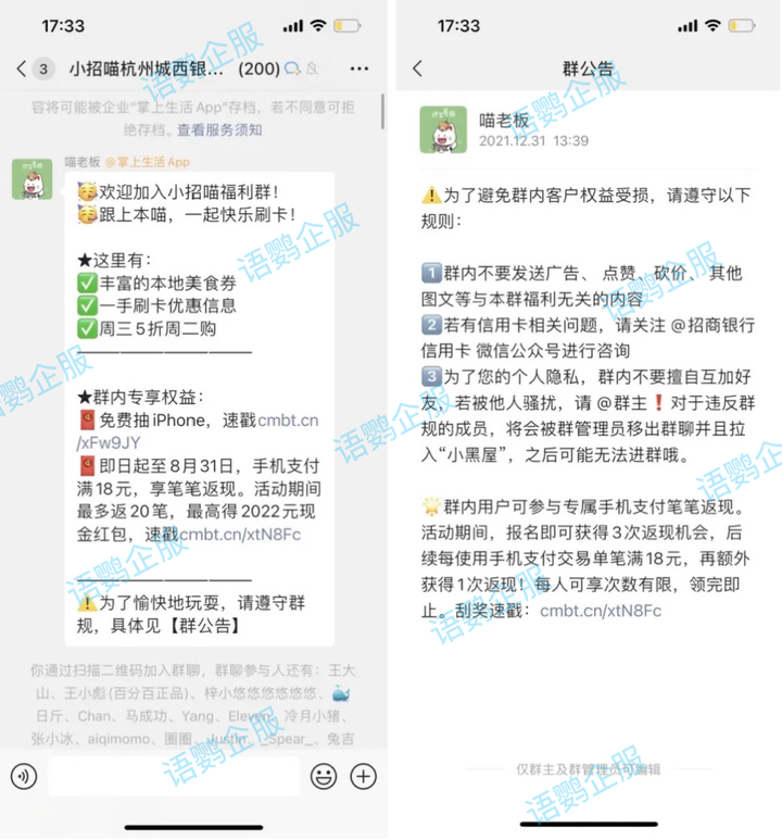 当拥有巨大流量池后,招商银行也是通过社群运营来活跃用户。比如通过语鹦企服的「入群欢迎语」功能,用户入群后立马触发欢迎语,以社群福利、专享权益、群规等引导用户参与返现活动。