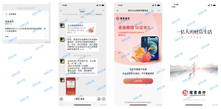 过去与银行打交道,客户都会留下联系方式,甚至是加微进行后续服务的,所以如今银行金融业在开展私域社群,会借助企业微信这样可带上公司名称的官方企业微信来邀请客户加企业微信,进行深度营销。