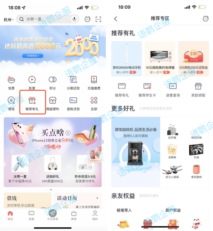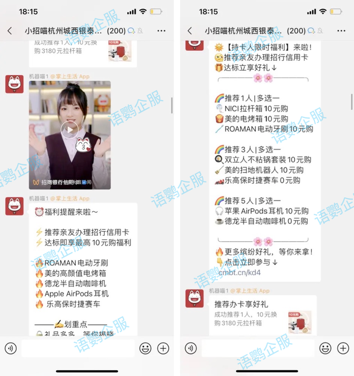 1)社群裂变:招行会定期在社群内推送「推荐有礼」活动,促进社群活跃互动外,还能起到引流作用。