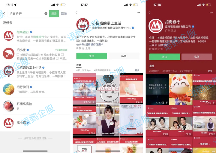 4)视频号引流:招商银行有5个官方视频号账号,以银行日常、宣传反诈小知识、福利活动推广等为视频内容,进行传播。其中有两个视频号有关联公众号,从而引导添加企业微信。