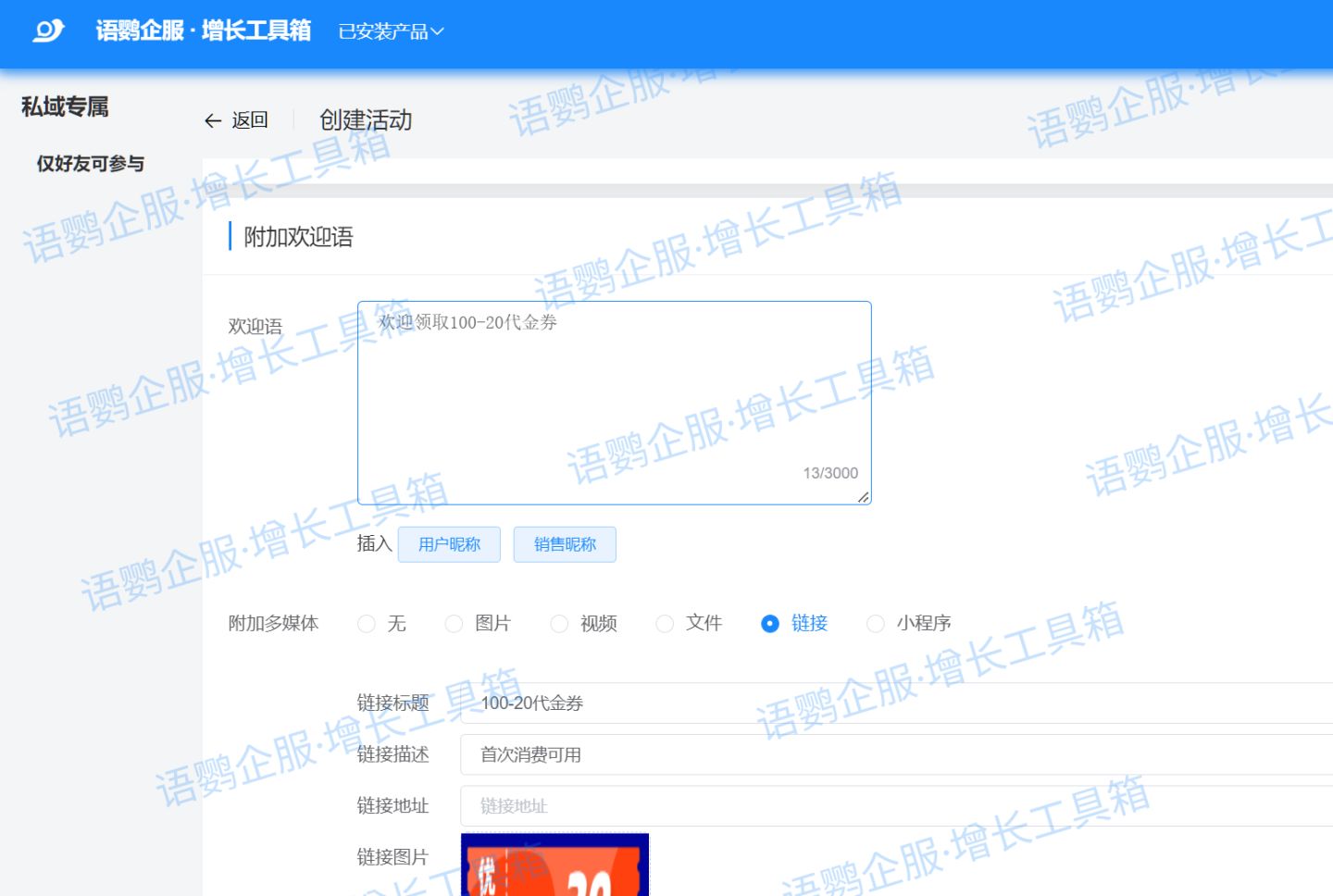 如果有客户比较反感扫码点餐的方式,企业也可以语鹦企服后台设置欢迎语,在客户添加好友时附加上欢迎语,欢迎语中添加上各种福利活动,附送代金券、饮料等福利,一般客户听到有福利可以领取都不会表示拒绝。