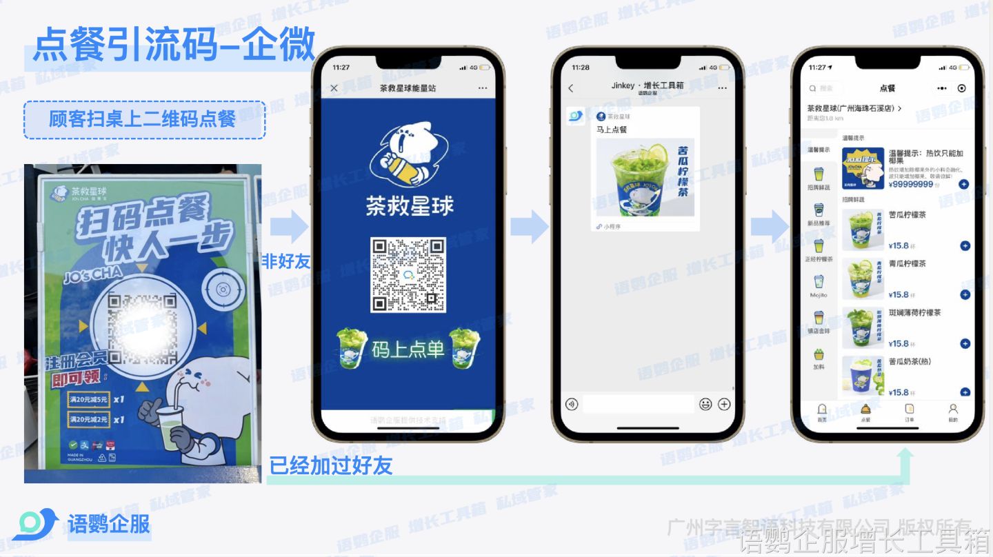 以上就是关于餐饮行业桌台码怎么设计以及如何将门店流量导流到企业微信私域问题的相关解答啦,餐饮企业可以借助语鹦企服【仅好友参与】的功能和点餐小程序结合,将客户引流到企业微信私域中来,再通过私域中的运营与客户产生进一步的联系,获取到更多的客流量