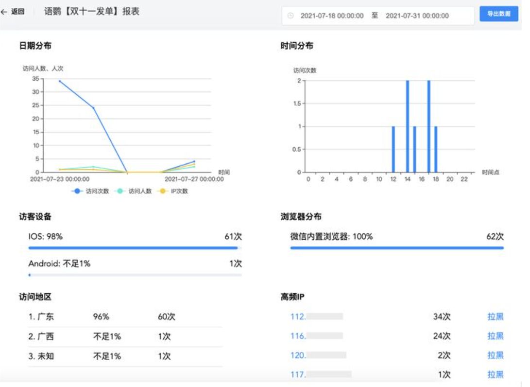 而且,电商企业在发单的时候也要注意做好数据观察,方便后续进行调整和改进,可以结合语鹦企服工具箱【社群链接跟踪】功能,对发单效果进行记录,可以重点关注链接的访问次数、人数、时间和访问地区这些数据,帮助企业优化营销内容,提升成交转化率。