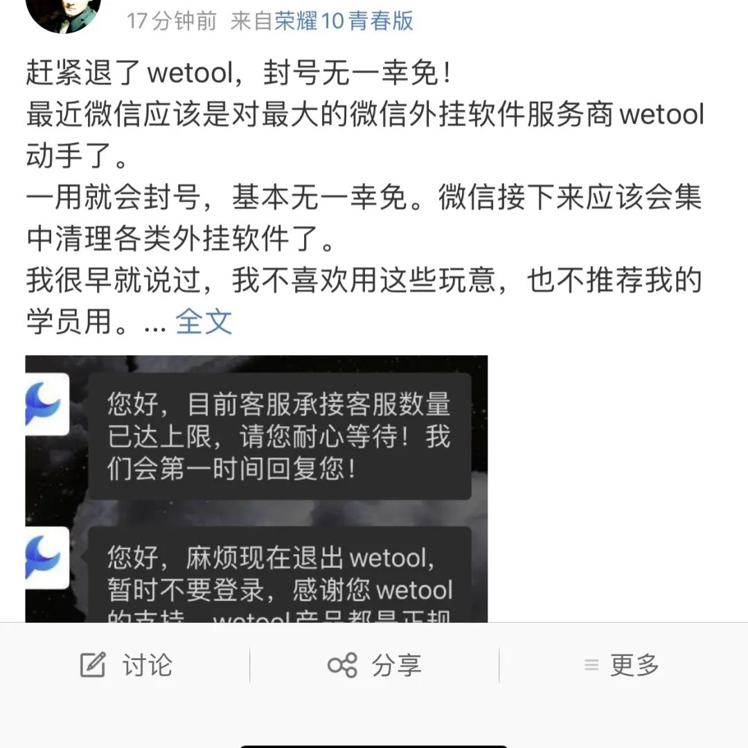 我们都知道,微信打击外挂,在微信上营销,最怕的就是被封号,号一封,所有的努力都付诸东流。而就在今天,微信终于对外挂软件wetool下手了!据网友透露,一用就会封号,基本无一幸免,你中招了吗?