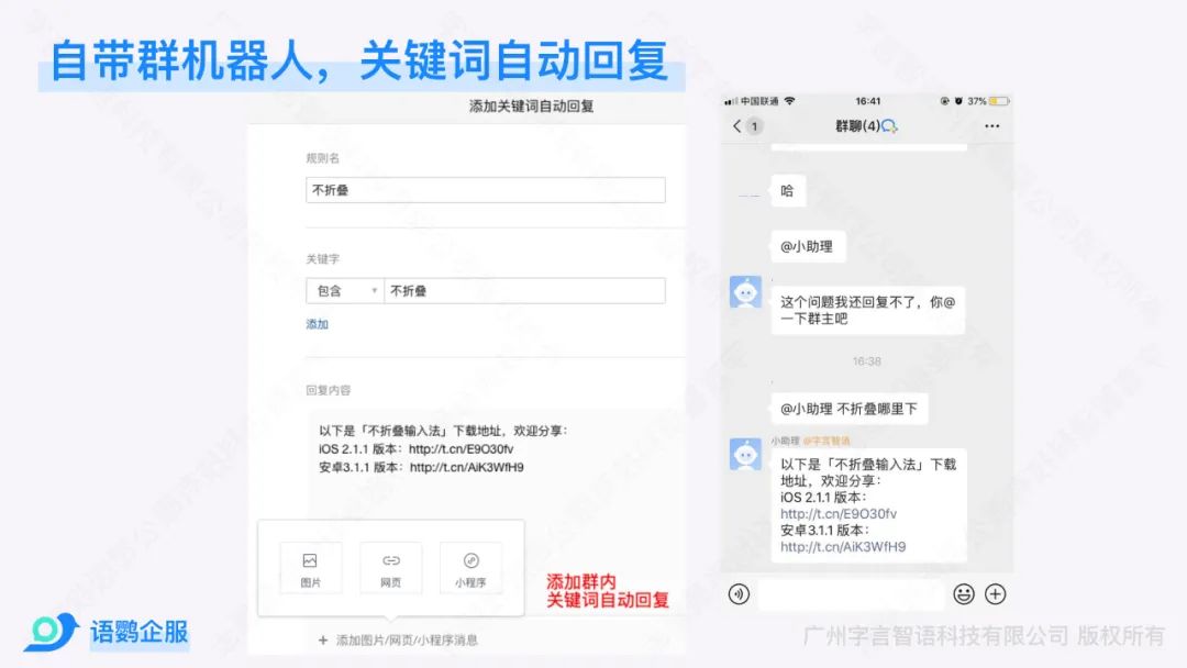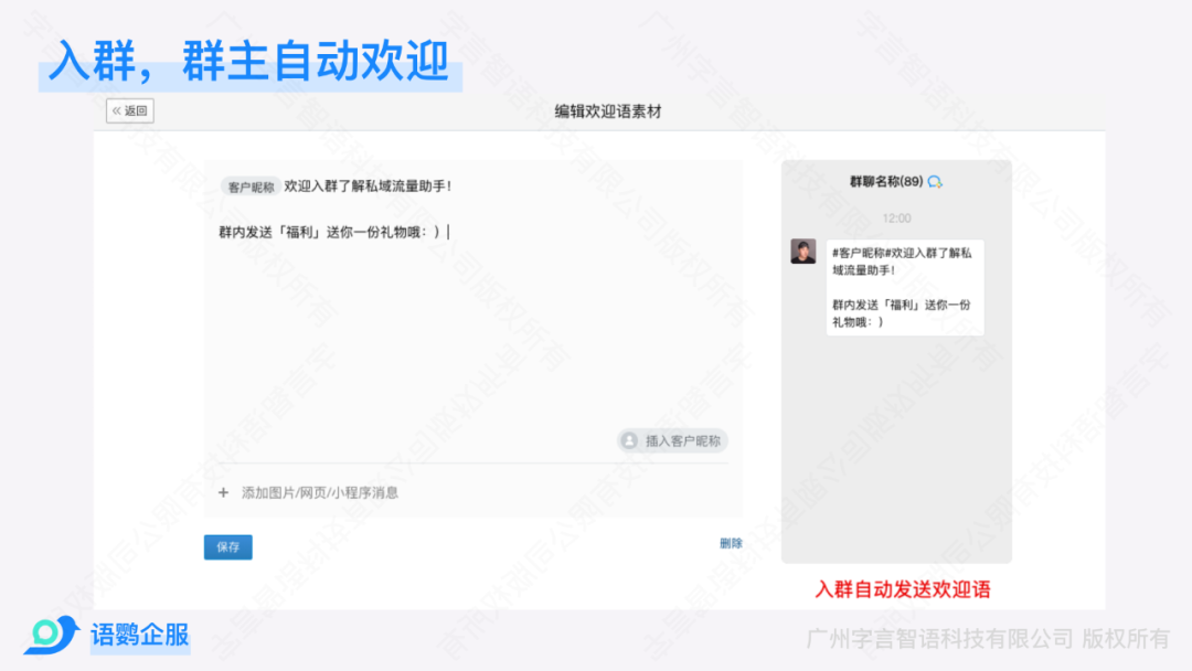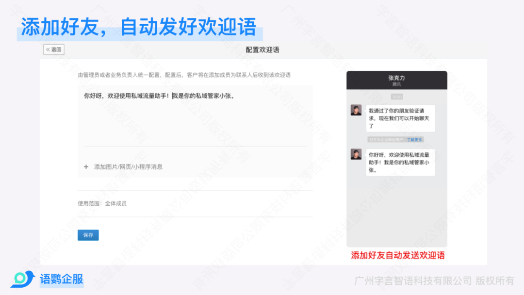 ①添加好友,自动发送欢迎语无需登录第三方平台,实时在线,自动发送