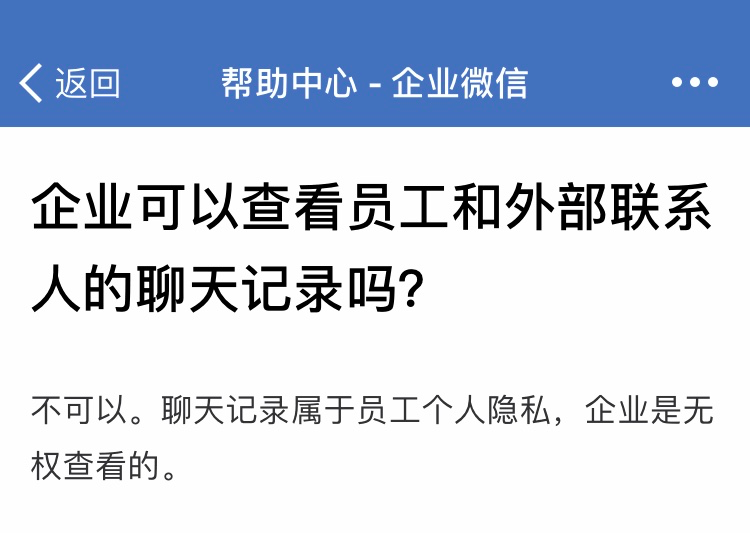 实际上,任何一家企业在不被授权的情况下,都无权查看员工的聊天记录。对于”企业是否可查看员工和外部联系人的聊天记录”,企业微信官方也表示:”不可以。聊天记录属于员工个人隐私,企业是无权查看的”
