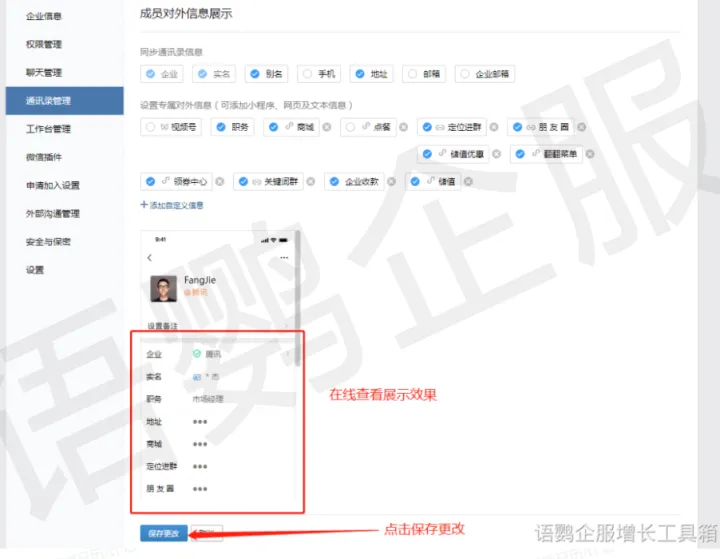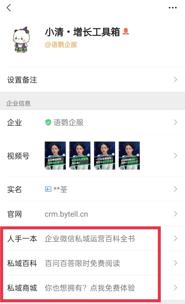 个人号的名片页,可以说是一个企业的门面。应该向客户展示什么内容,有助于客户在第一时间了解企业。因此企业可以通过后台,设置员工个人号的对外资料显示模块,还可以配合企业的性质,设置【自定义信息】,也是企业文化的一种很好的展示。