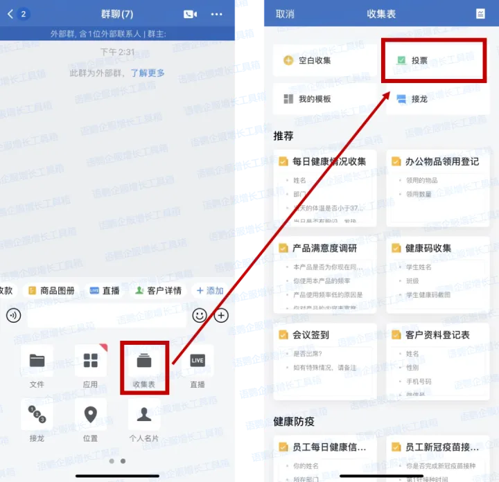 打开企业微信APP,进入群聊,点击输入框旁的“+”,打开工具栏,右滑找到“收集表”,点击进入“收集表”界面,找到“投票”,点击进入设置页面。