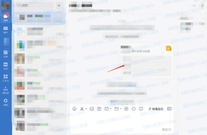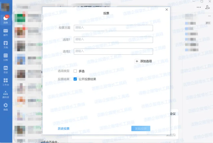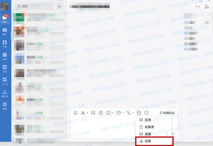 打开电脑端的企业微信,进入群聊界面,点击“…”图标,即可找到投票功能,点击进入配置页面。根据需要完成相关配置即可发布。