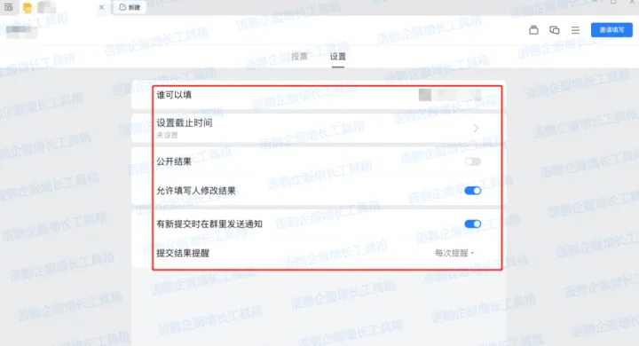 在设置页面,可根据需要灵活配置投票主题、封面、选项、截止时间。在选项配置中,最多可配置20个选项, 同时亦可结合实际情况考虑是否需要开启多选模式、以及是否允许修改结果等。另外,如需在提交时在群里发通知,还可选择提醒频次,避免过多提醒打扰群员。