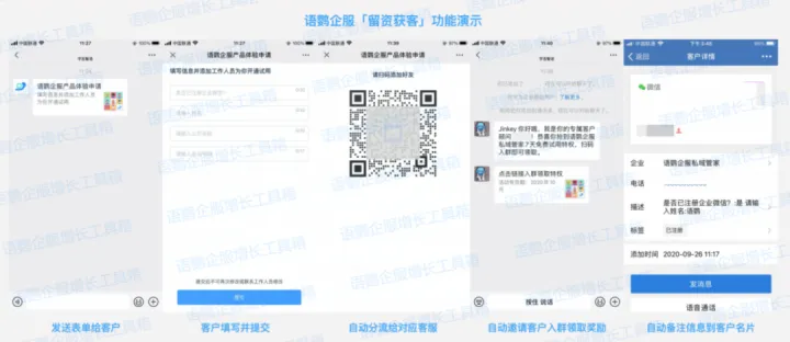 除此之外,企业如需收集更丰富的客户信息、了解客户喜好,并更深度进行运营,还可使用语鹦企服的【留资表单】功能。此功能可帮助企业高效快速收集客户信息,并对客户进行相关管理,如填表、选择单选选项后等能自动备注客户名片,自动对相应客户进行打标签,创建立体丰富的用户画像,为后续精细化的用户运营,提供有效数据支持。。