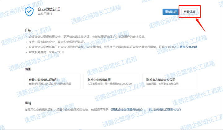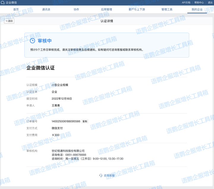 企业微信认证支付成功后,您可在「企业微信认证」-「查看订单」-「认证记录」,点击进入即可查看第三方审核公司的客服热线。