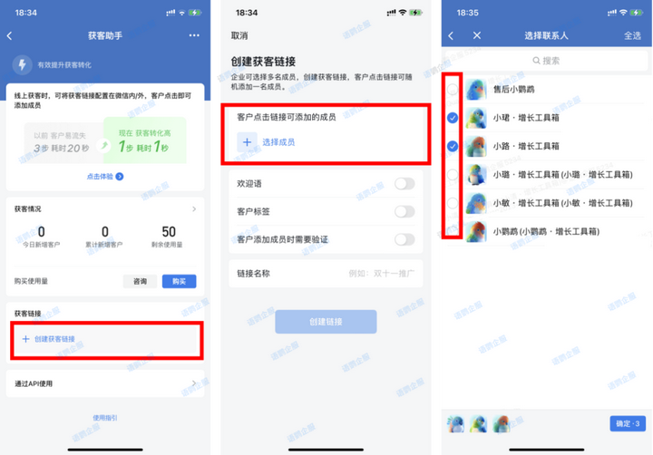 企业点击获客助手 — 点击创建获客链接 — 选择想要获客添加到的成员名称即可,而且可支持成员多选,实现一个链接分流随机添加到不同成员。