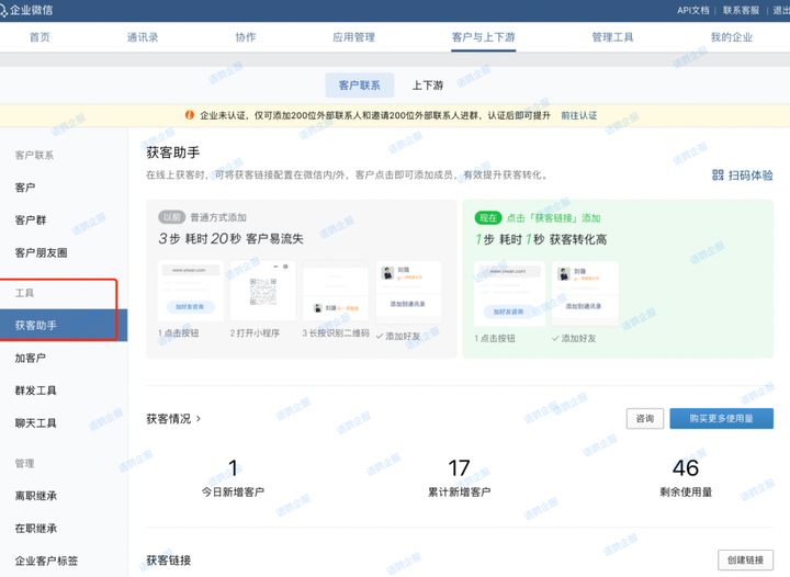 以上就是关于《企业微信的获客助手是什么?企业微信获客助手怎么用?》的全部内容了,获客链接是一个基础能力,打破了非腾讯平台的获客场景,可支持抖音/百度/快手/抖音小风车等广告落地页以及短信、官网、App等常用引流场景,为商家获客提供了便利,但投放仍需注意遵守第三方的运营规范,同时不断优化和改进私域获客的方式及内容,好的内容策略才是私域取得成功的根本!更多私域内容欢迎关注语鹦企服。