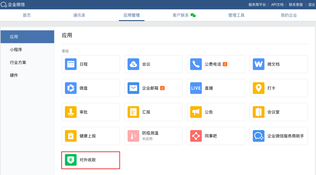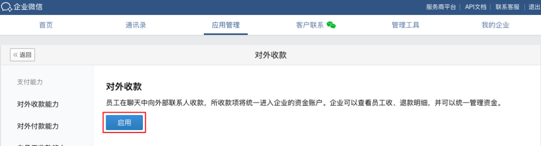 登录企业微信管理后台,点击【应用管理】-【对外收款】,即可【启用】对外收款功能。