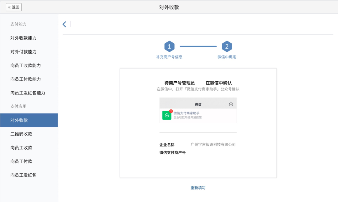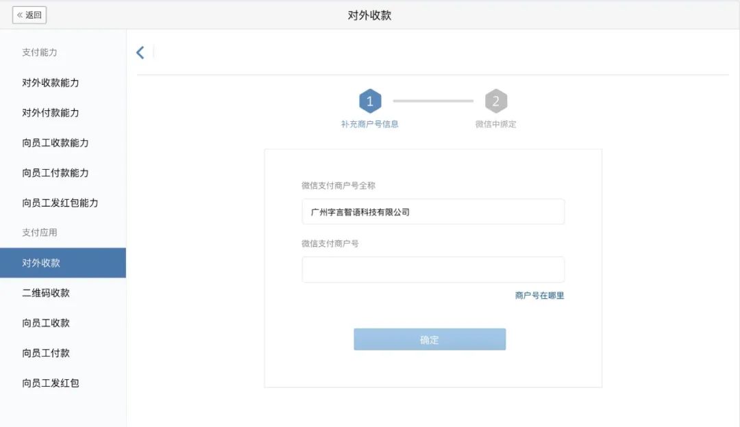 初次开启对外收款需要先补充商户号信息,并在微信中绑定。如果没有商户号,可登录微信支付商户平台pay.weixin.qq.com申请
