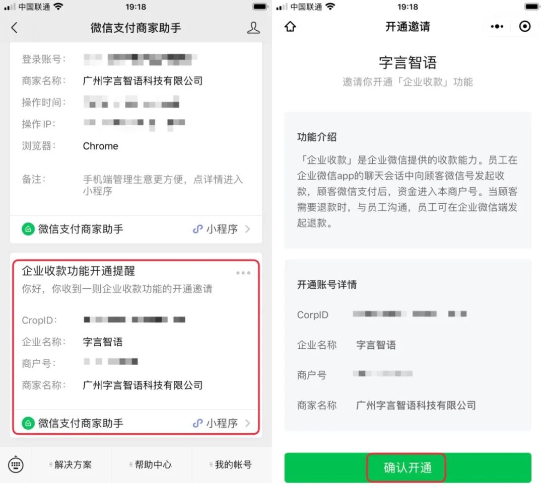 填写好商户号后,点击确定。微信商户号管理员就会在微信上收到【企业收款功能开通提醒】,点击提醒并【确认开通】,即可完成对外收款启用流程。
