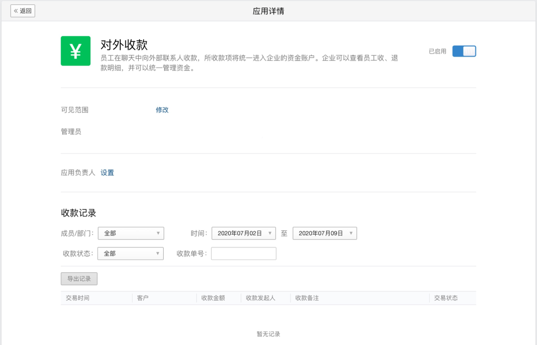 点击【应用管理】-【对外收款】,即可设置对外收款功能的可见范围和管理员。