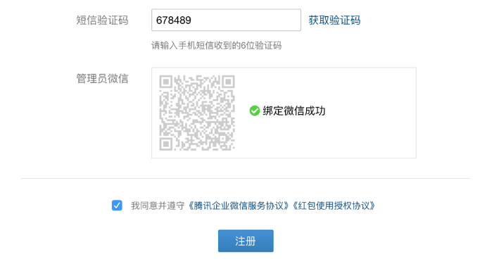 输入完验证码后,使用微信APP扫描注册页面上提供的微信二维码,将企业微信与微信账号进行绑定。