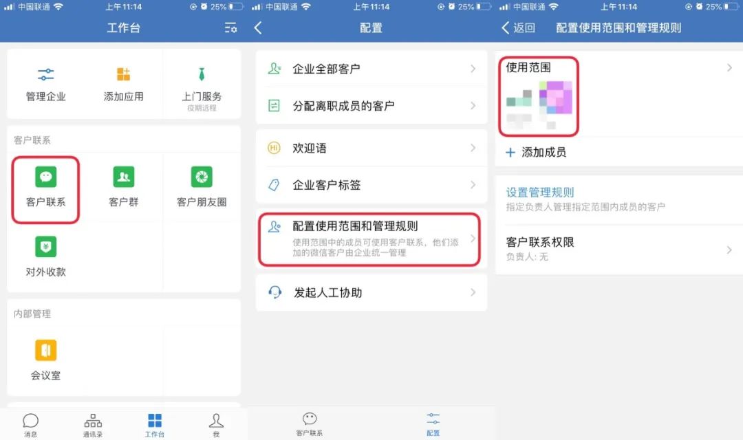 管理员或负责人打开企业微信工作台,点击【客户联系】,在配置页面找到【配置使用范围和管理规则】,添加该员工到使用范围内即可。