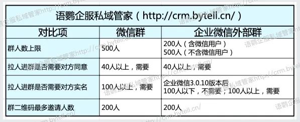 可以看到,无论是在企业微信上还是在微信上,拉群的限制都是一样的。不同的是,微信群人数上限是500人一个群,而由企业微信用户创建、包含了微信用户的外部群上限是200人(如果不包含微信用户则是500人)。