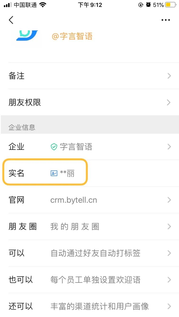 这样客户与你沟通时,或者打开你的名片信息,会看到实名一栏隐藏了实名,只显示最后一个字,从而实现对外隐藏实名信息了,是不是很简单~