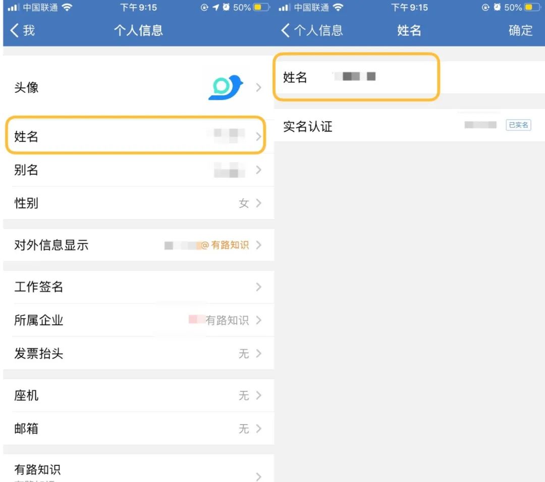如果对内也不想显示实名信息,则只需把【个人信息】页面中的【姓名】,也一起改为别名/花名就可以了,这样跟企业内部成员聊天时,也不会显示真实名字。