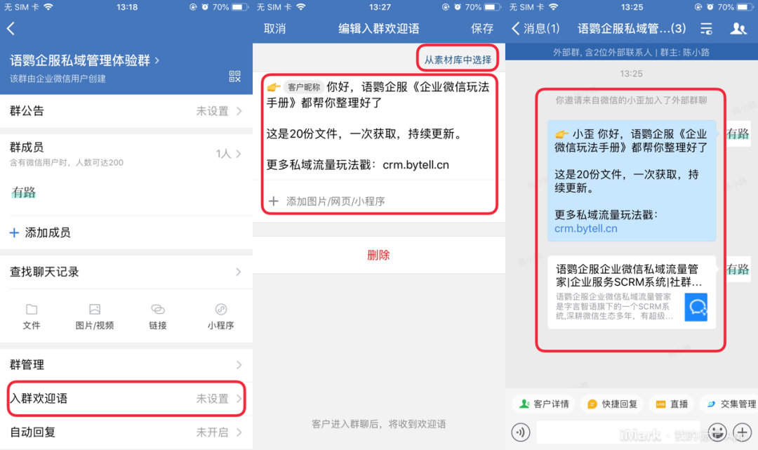 另外借助企业微信新一代CRM工具语鹦企服私域管家(crm.bytell.cn),还可实现智能分配多个销售、展示企业微信历史朋友圈、裂变海报验证进群工具、跨平台话术库、智能欢迎语等功能,帮助企业更好经营并管理客户。