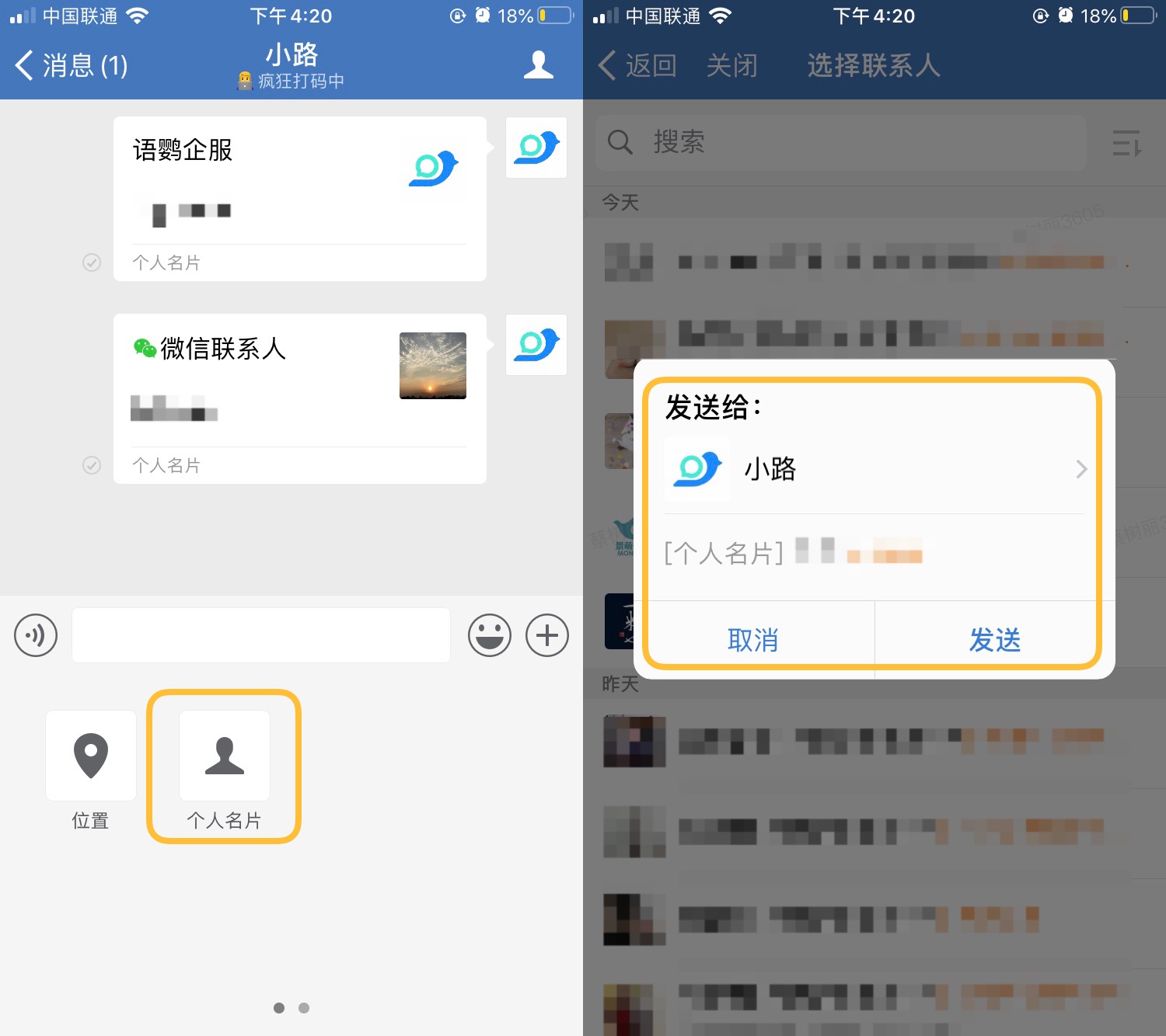 相对方法一,还有一个更为便捷的共享客户方法。假设我想把客户B共享给同事A,只需点开与A的聊天窗口,点击右下角的「+」号按钮,调出「个人名片」功能,即可选择分享客户B的名片给同事A,同事A在聊天窗口点击名片即可添加客户。如果需要共享多个客户给同事A,重复操作即可。