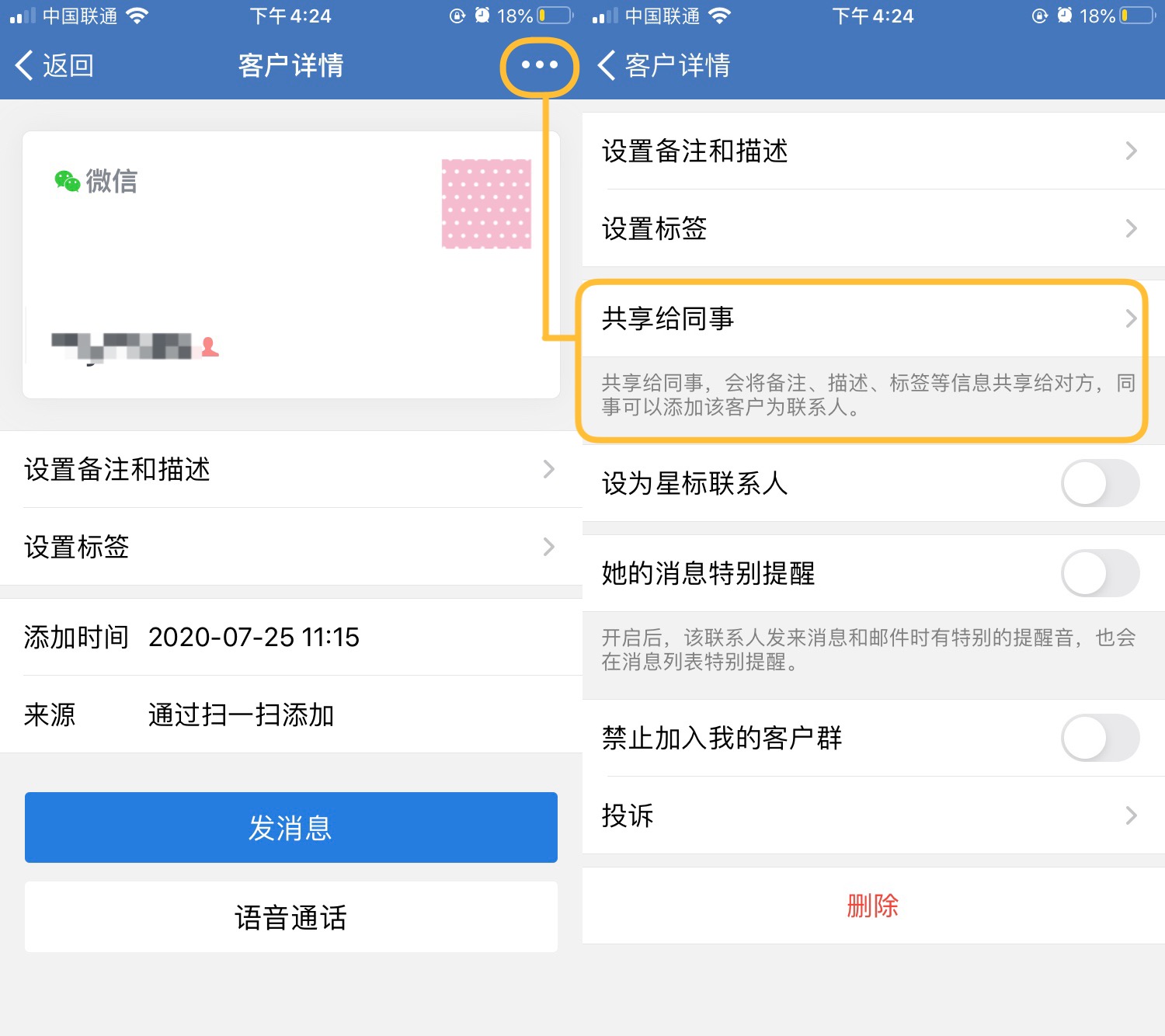 通过将客户「共享给同事」,给客户添加的备注、描述、标签等信息也会一起共享给同事,但需要同事添加该客户为联系人,并且客户通过同事好友申请后双方才可沟通。