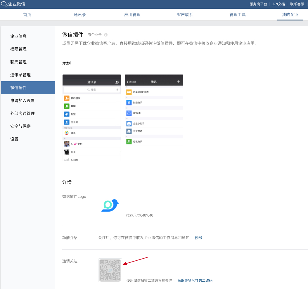 微信插件二维码需要管理员在【企业微信后台-我的企业-微信插件】页面获取,并发送给员工微信扫码关注。