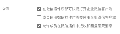 如图所示,当勾选第1和3选项时,员工在微信插件底部即可快捷打开企业微信客户端,也可在微信插件中接收和回复聊天消息。如果勾选了第2选项,则企业成员只能在微信插件收到提醒,想要收发消息则需要打开企业微信客户端。