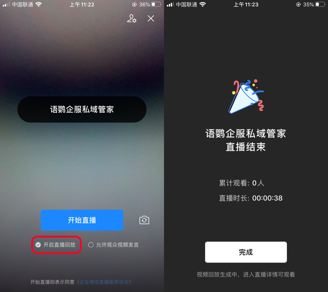 只需要主播发起直播时勾选回放按钮,在直播结束5分钟后,观众再次点击直播卡片就可以看到回放视频了。