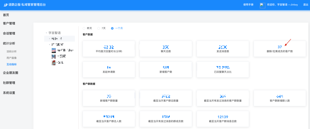 在【统计分析-互动指标】模块,也可按部门、按时间查看员工被删除/被拉黑客户总数,从而直观了解客户留存情况。