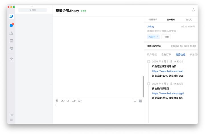 如上图所示,借助语鹦企服私域管家的开放组件能力,用户浏览了产品设计的文章就能打上”产品设计”的标签,浏览数据分析的文章,我们就打上”数据分析”的标签。