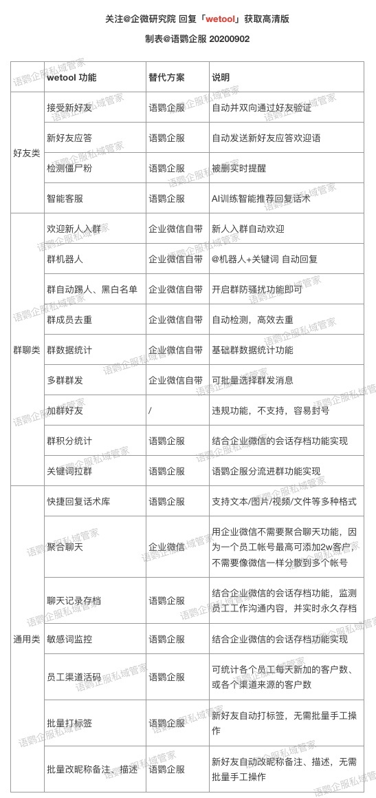 下面就通过对比的方式,来看看「企业微信+语鹦企服私域管家」是如何代替 wetool 的?公号@企微研究院 回复【wetool】获取高清对比图。