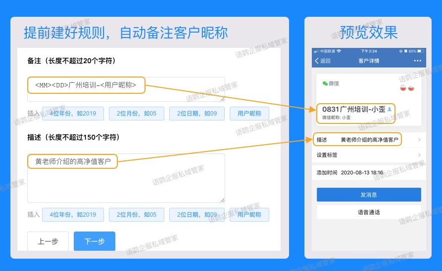 企业只需通过语鹦企服生成员工活码,客户扫描活码名片并发送好友申请的一瞬间,就可以实现以下4项自动化操作,便于后续精细化运营: