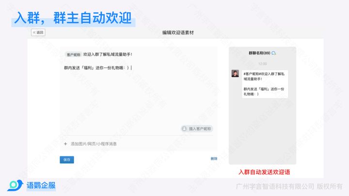 我们在企业微信的后台设置【入群欢迎语】功能后,如果有新的用户入群,系统会自动@Ta并发送一条欢迎语或是入群福利等等。这样可以更好地照顾到新入群的客户,提高企业的服务质量。
