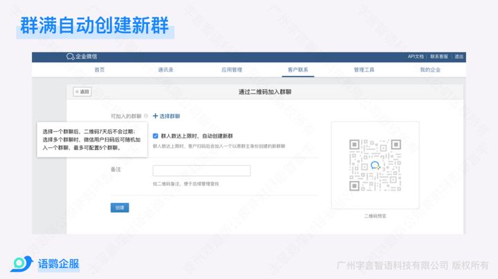 我们在企业微信后台的【客户联系】中,可以创建永久入群的二维码,并且可以勾选【群人数达上限时,自动创建新群】的选项,这样当群人满时,就会自动创建新群,原来的群主也会自动成为新群的群主,便于企业的运营和管理。