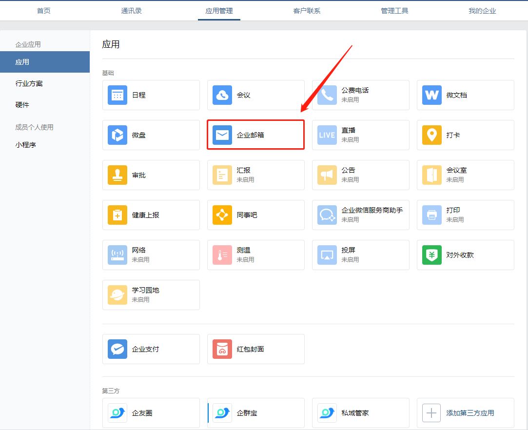 如果公司管理员未启用企业微信邮箱服务的话,那么我们就没办法在这里找到邮箱入口了,我们需要先去启用企业邮箱。首先,打开企业微信管理后台的「应用管理」-「企业邮箱」可以看到企业邮箱的右侧有一个小小的按钮,鼠标点击后变为蓝色旁边标注“已启用”字样,即可开通企业微信邮箱服务。