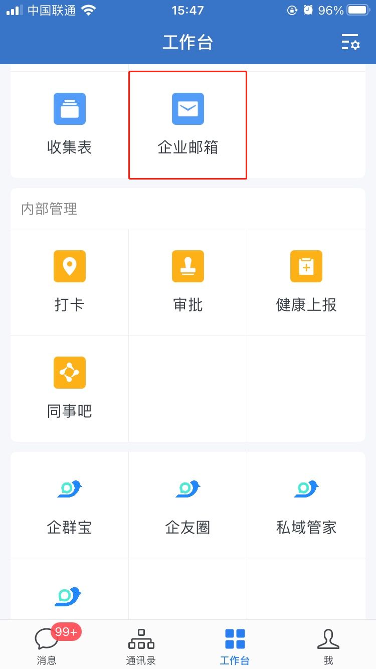 毋庸置疑,企业微信是有邮箱的。手机端的企业微信邮箱位置:打开手机里的企业微信APP,在企业微信「工作台」既可看见入口。
