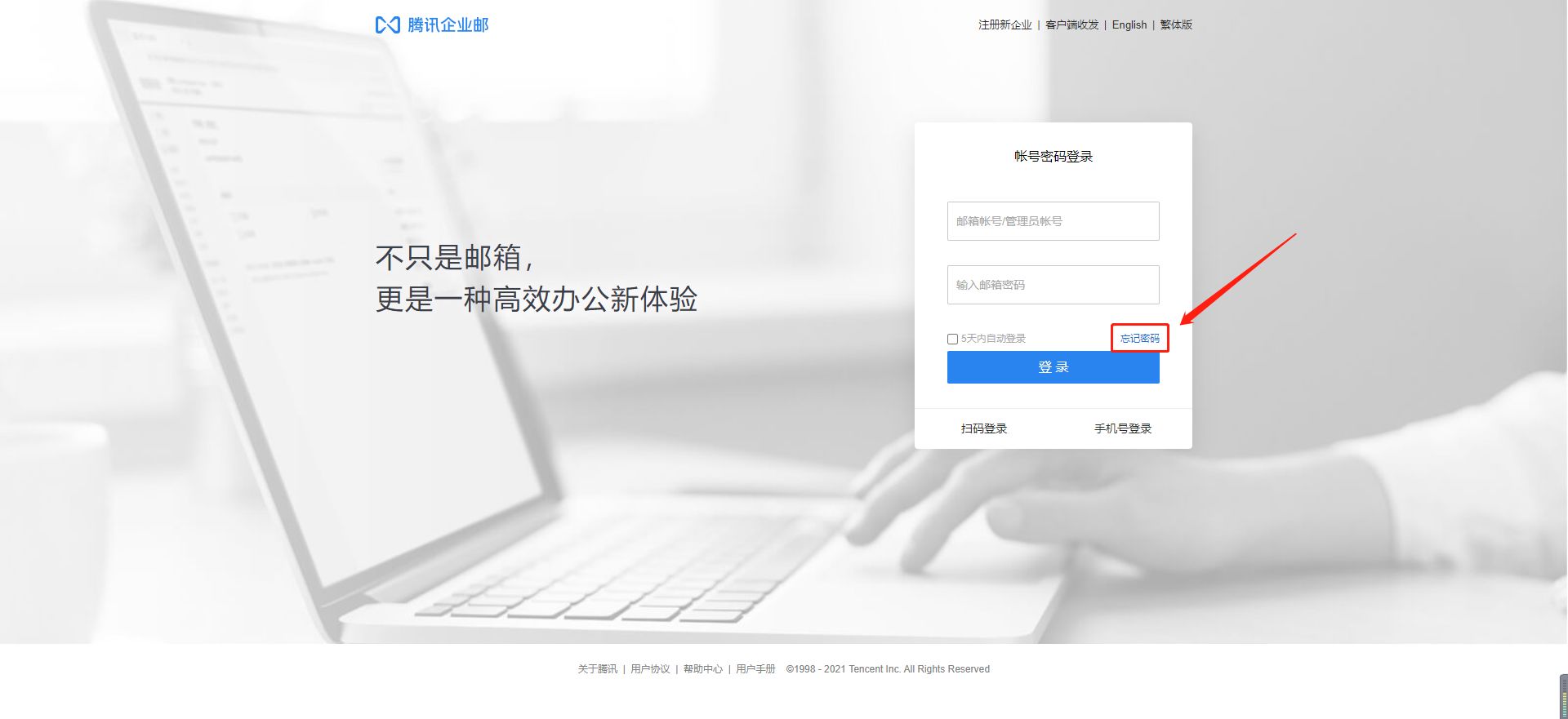 使用电脑端登录腾讯企业邮箱官网,点击「登录」,在「账号密码登录」界面,选择「忘记密码」,按照页面提示进行输入。