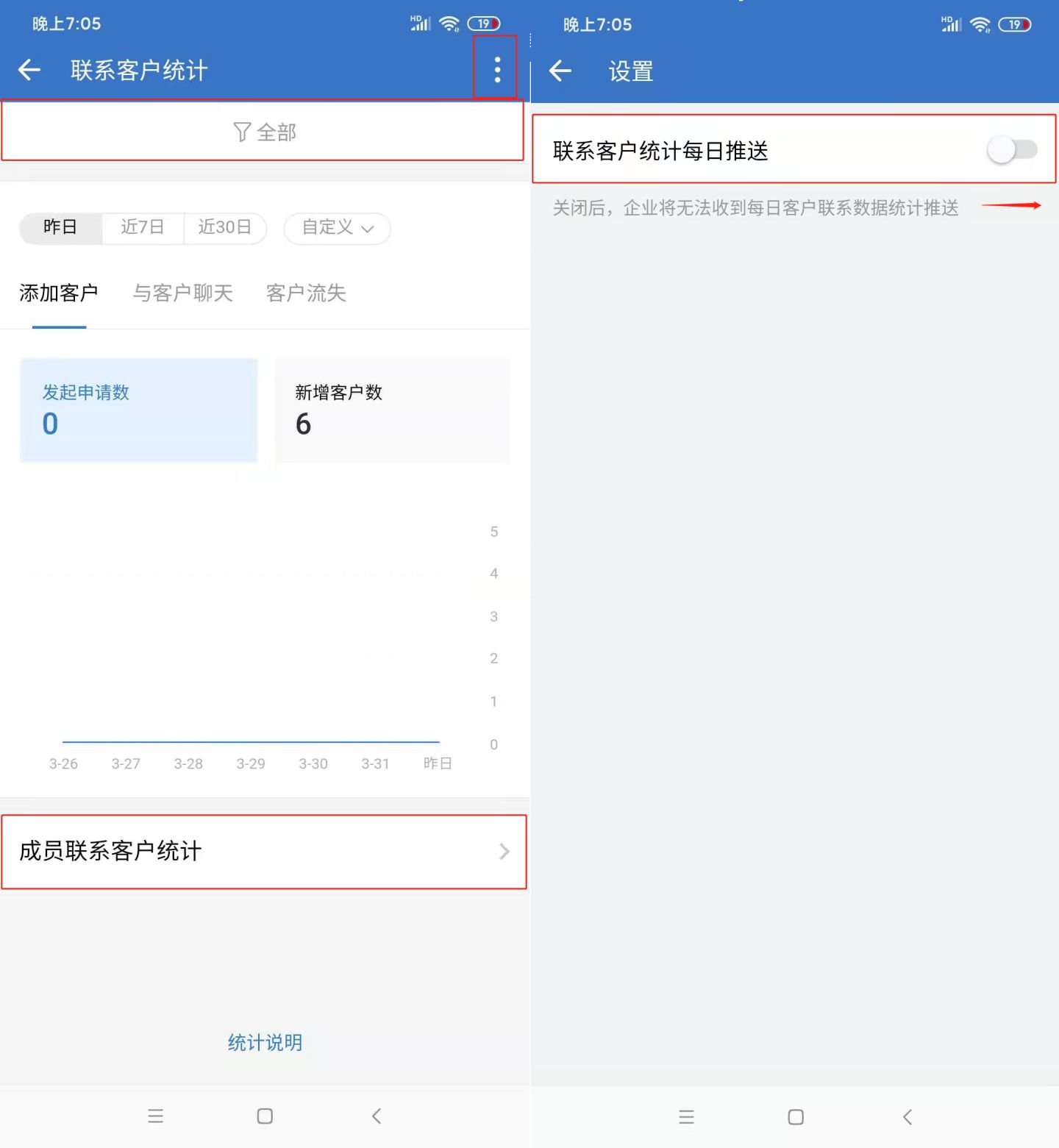 而管理员还能在 「联系客户统计中」选择企业成员查看客户联系情况,也会自动生成统计,只需点击 「成员联系客户统计」即可查看,并且点击右上角三个点,还能开启 「联系客户统计每日推送」。开启后,企业就会每日都收到客户联系数据统计的推送,帮助企业及时掌握客户联系数据情况 。