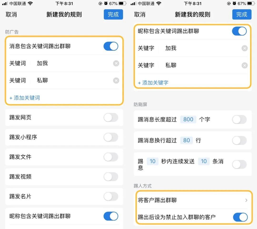 这种方法可以通过运营者设置的关键词,如“加我”、“私聊”等,将可疑的成员踢出所有的群并拉黑,节省运营者的时间成本。