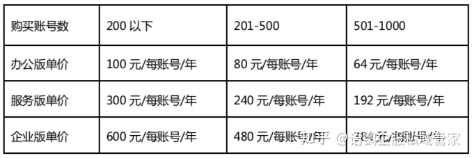 当购买账号数在200以下时,办公版为单个账号100元/年,服务版为单个账号300元/年,企业版为单个账号600元/年;