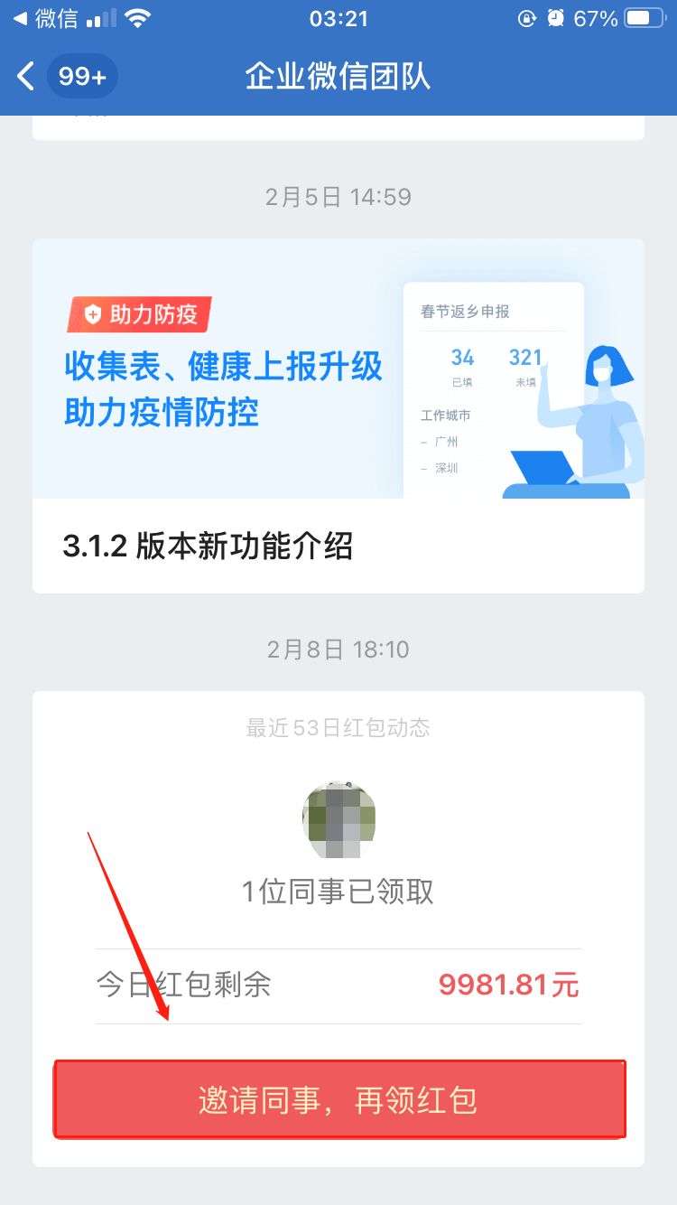 第三种:你的同事加入企业,或者你的同事邀请人好友加入企业领取了红包,企业微信团队还会在手机上推送消息通知,而在这里也可以邀请领红包。